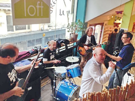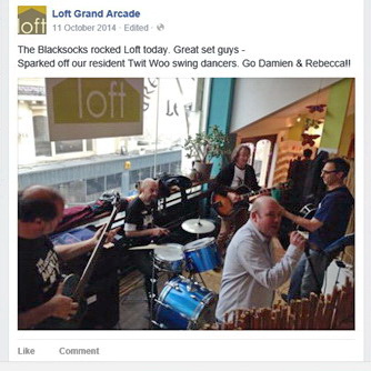 The band were delighted to carry their PA through a crowded Casa Columbia then play 2 sets of quirky tunes in The Loft above. Blacksocks & black coffee were a perfect combination.