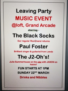 For the last time! Whilst the gorgeous smell of Columbian coffee wafts up to the Loft from Casa Columbia below the The Blacksocks performed, with others, for staff, friends & shoppers in The Loft retail space in the Grand Arcade ,Leeds at their leaving party.